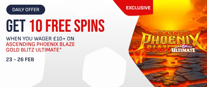 *Free Spins: max 10 per day 23/02 - 26/02. Use on Ascending Phoenix Blaze Gold Blitz Ultimate (3 day expiry, 10p per spin). T&Cs apply.