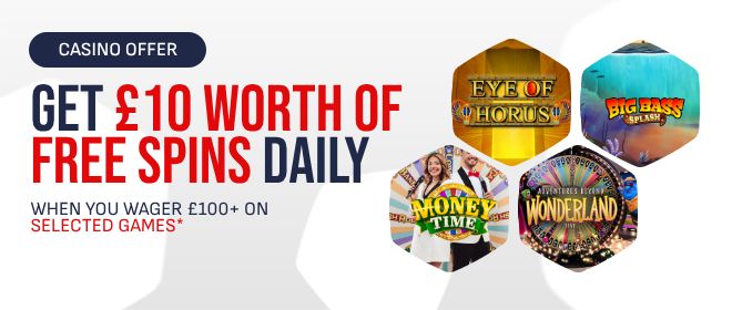 *Free Spins: max 10 per day 21/02/26 - 23/02/26. Eye of Horus only (3 day expiry, £1 per spin). T&Cs apply.